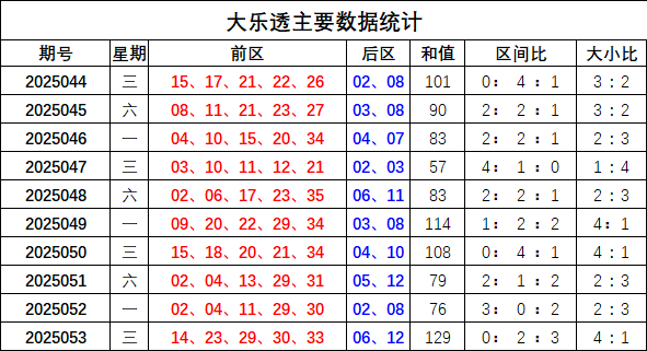 上期回顾:大乐透上期奖号为:前区14 23 29 30 33,后区06 12,前区奖号和值为129,区间比0:2:3,大小比为4:1,
